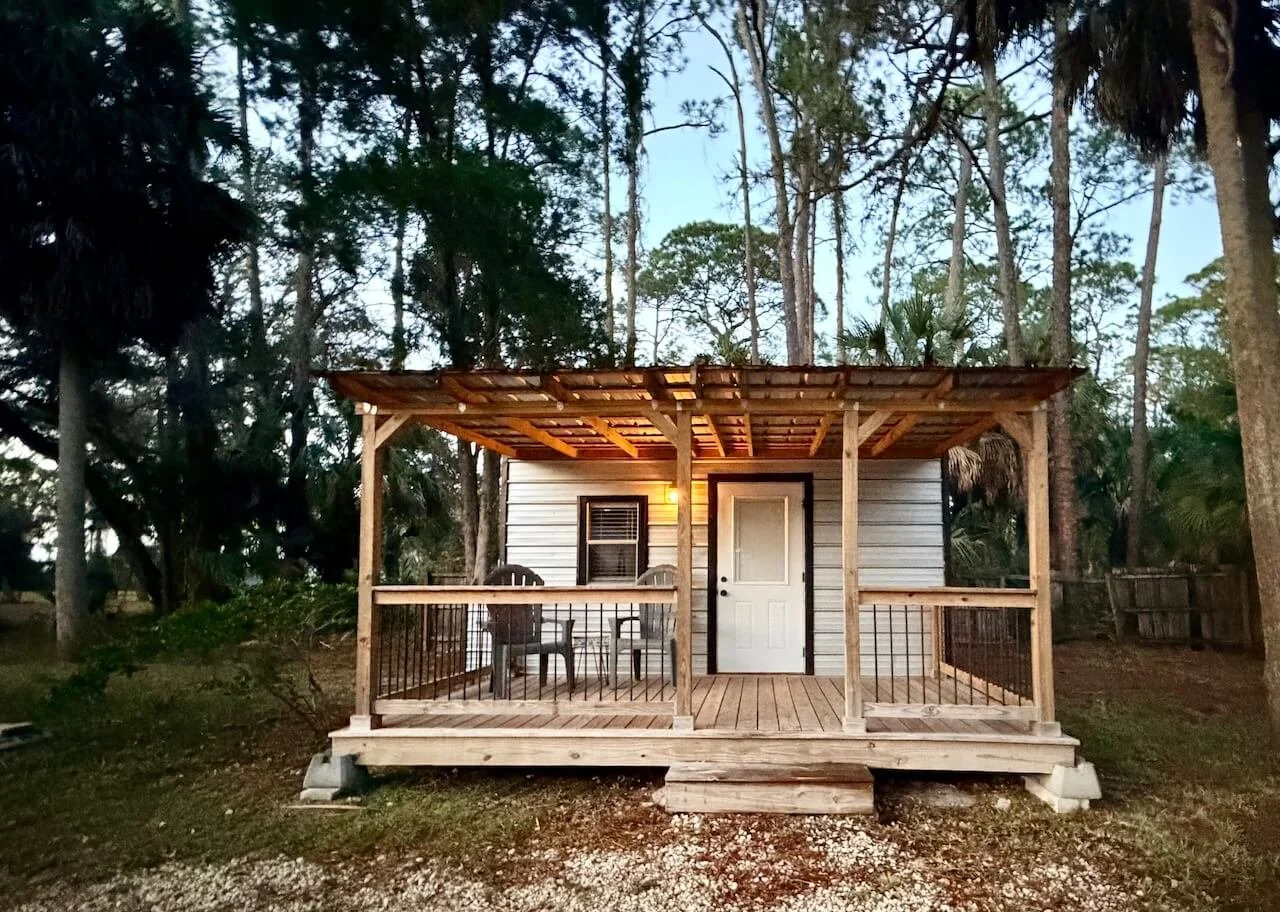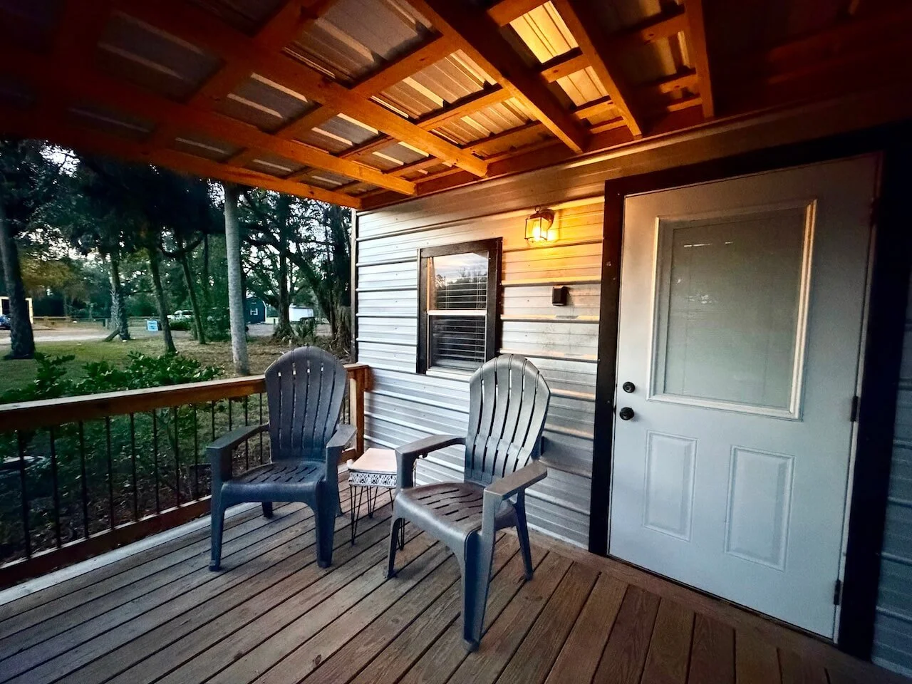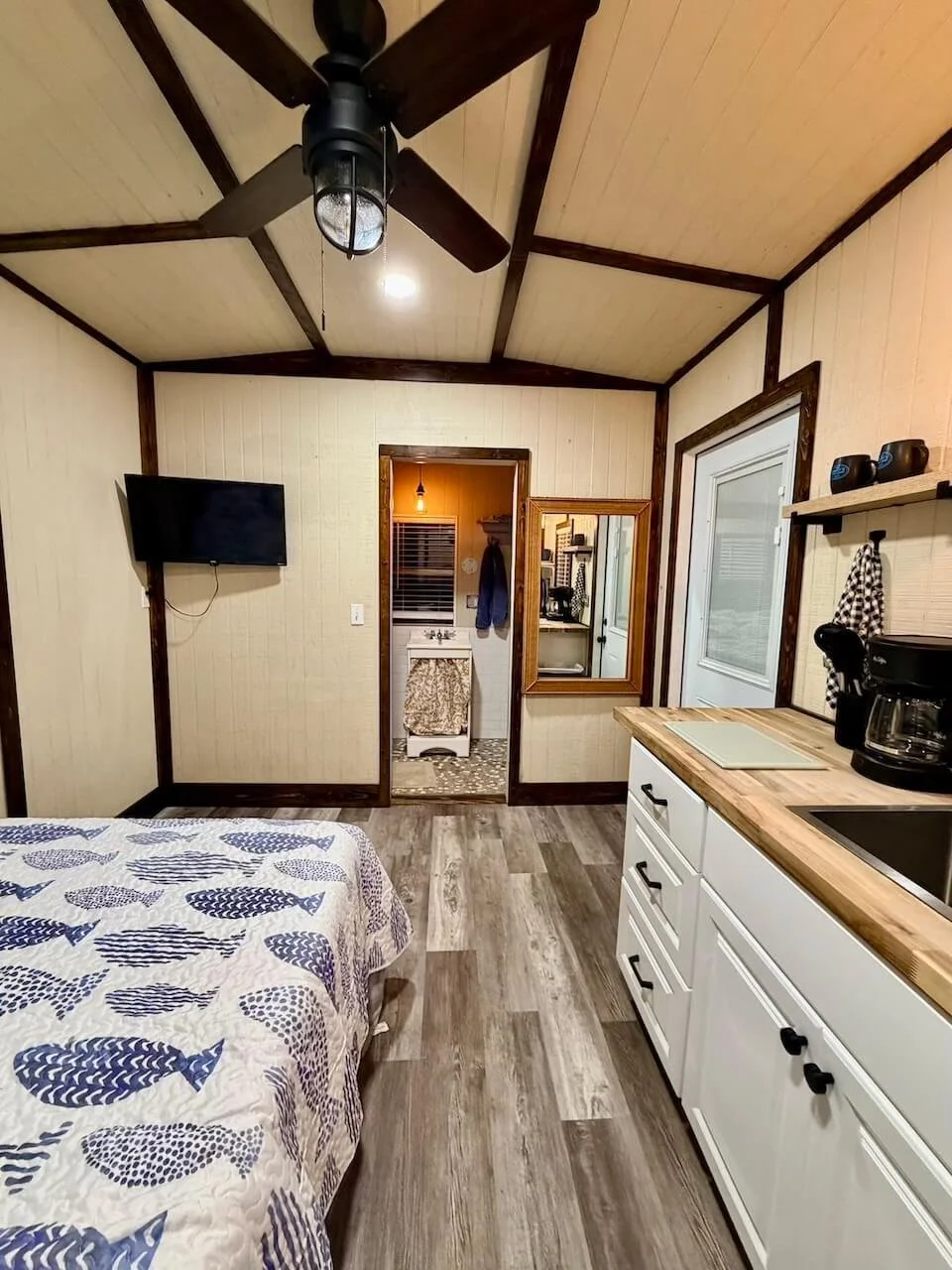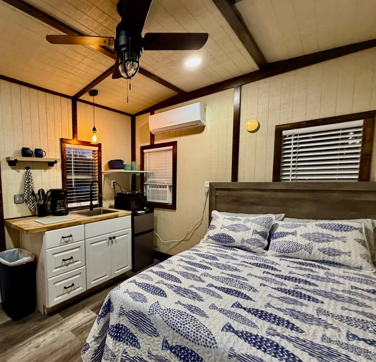 Our cabin 5 is lovingly called our tiny “tiny home” with a HUGE porch. This cabin can sleep two comfortably on the full size bed. Located next to our new cove on the water this cabin is perfect for a single person or romantic getaway!